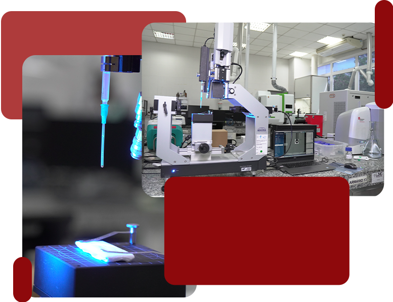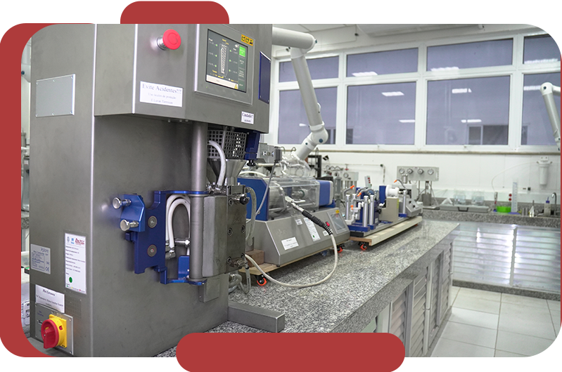 Finalmente, para o processamento de polímeros e nanocompósitos, o laboratório conta com um sistema de processamento em microescala que inclui uma mini-extrusora, mini-injetora e acessórios para preparação de filmes e filamentos para impressora 3D.